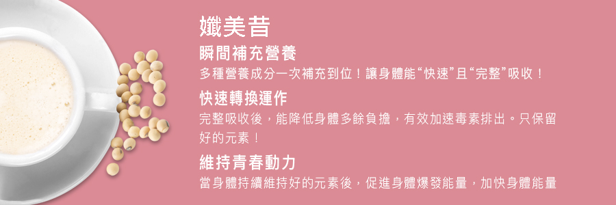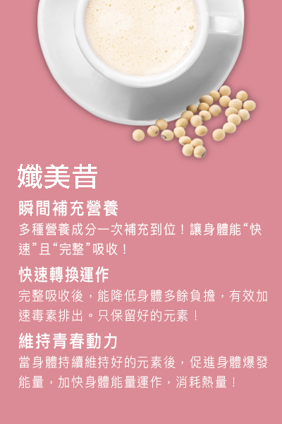 喝完一杯300ml孅美昔,等於瞬間補充超多種營養成分!加速身體能量的轉換!留住好的成分,汰換身體不要的成分。讓身體轉變為青春活力的模樣! 不管是當作代餐使用,或是運動後能量補充後使用,都能夠瞬間給予營養及能量!持續使用,也能夠輕鬆的加速身體能量運作,快速消耗身體熱量!